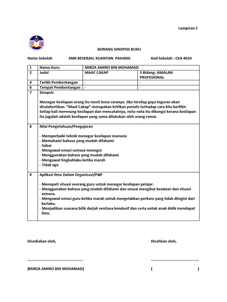 Lampiran c borang sinopsis buku nama sekolah: Smjk poi lam,ipoh kod sekolah:aeb2054.